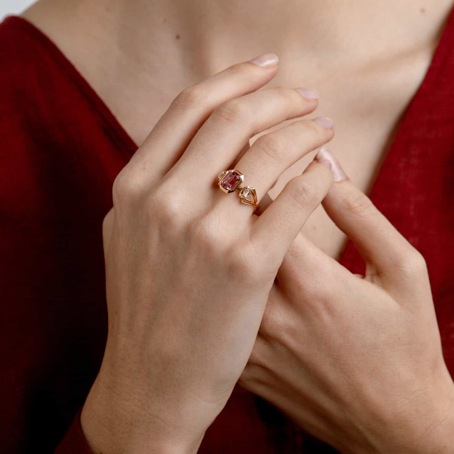 One of the most popular coloured gemstones, prized for their rainbow-like range of hues and translucent lustre. This distinct family of boron minerals has a complex chemical composition, with numerous permutations. They can occur in almost any imaginable colour, and this bespoke ring features rubellites, which are the saturated dark pink to red variety of tourmalines.